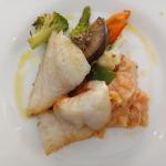 Gallineta al horno con ajo colorao y verdura salteada