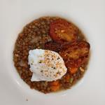 Lentejas con tomates asados y huevo poche espolvoreado con Dukka