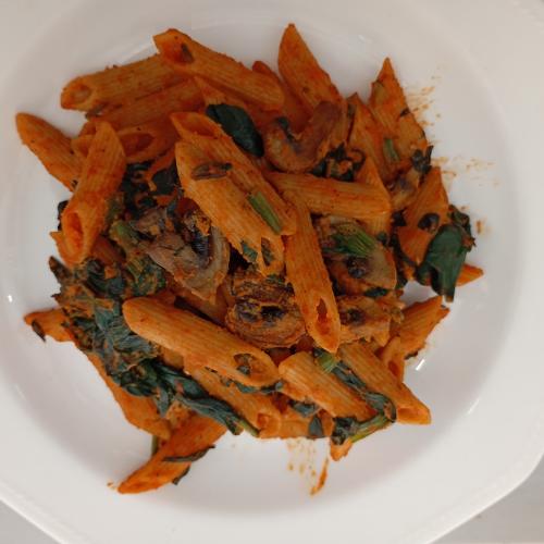 Pasta integral con praliné de romescu champiñones y espinacas