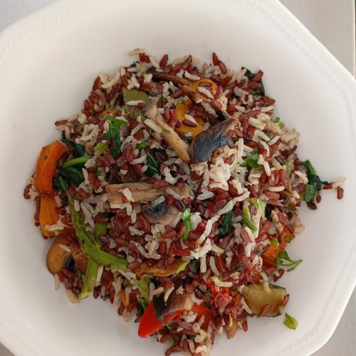 Verduras salteadas y arroces integrales con hierbas aromáticas