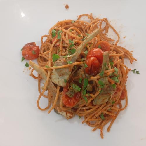 Pasta al pesto rojo con alcachofas tomates cherry y alcaparras